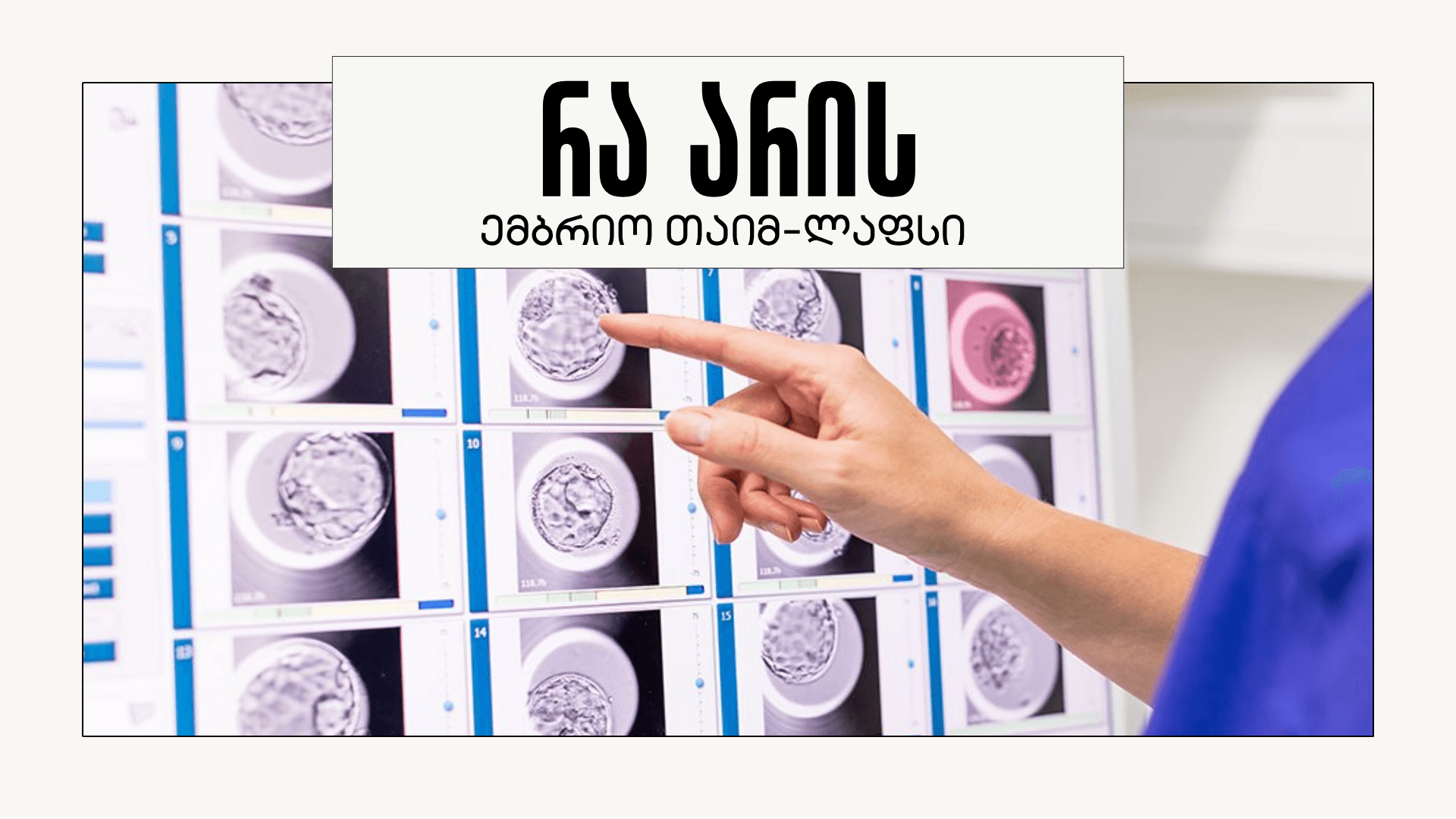 ემბრიო თაიმ-ლაფსი წარმოადგენს თანამედროვე, ინოვაციურ ინკუბაციურ სისტემას, რომელიც უზრუნველყოფს ემბრიონების ზრდისა და განვითარების უწყვეტ, დეტალურ მონიტორინგს. მოწყობილობაში ინტეგრირებულია მაღალი რეზოლუციის მიკროსკოპი, კამერა და ხელოვნური ინტელექტის (AI) ალგორითმები, რაც შესაძლებელს ხდის ემბრიონის განვითარების ობიექტურ და დინამიკურ შეფასებას მისი კულტურული გარემოდან ამოღების გარეშე.